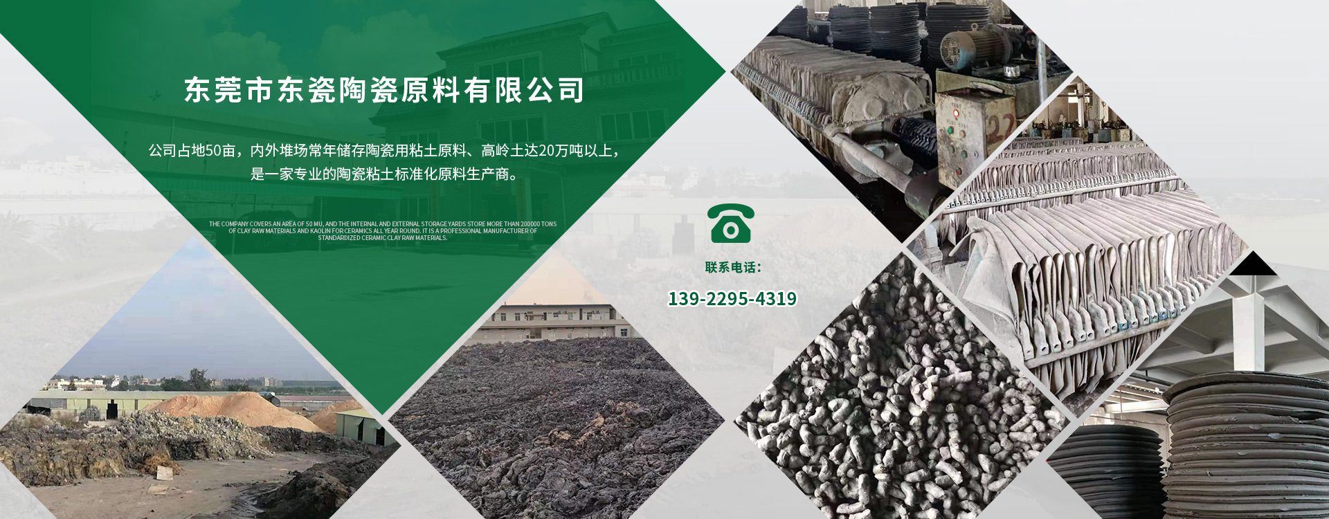 東莞市東瓷陶瓷原料有限公司創(chuàng)建于1995年,位于東江之濱,廣東省荷花名鎮(zhèn):東莞市橋頭鎮(zhèn),珠江流域及沿海各省的運(yùn)輸十分便利,公司占地50畝,內(nèi)外堆場(chǎng)常年儲(chǔ)存陶瓷用粘土原料、高嶺土達(dá)20萬(wàn)噸以上,是一家專(zhuān)業(yè)的陶瓷粘土標(biāo)準(zhǔn)化原料生產(chǎn)商。